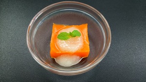 ④缶詰のパインでソースを作り、上からかけミントを添える